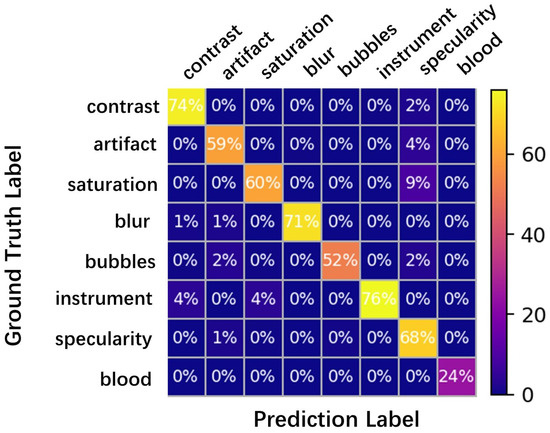 The confusion matrix is an matrix used to evaluate the performance of a classification model, where N represents the number of target categories. The matrix compares the actual and predicted class labels and assesses the predictive performance of the model. By analyzing the entire dataset, one can determine the number of correctly and incorrectly predicted samples, thus measuring the model’s predictive effectiveness. The confusion matrix, as presented in Figure 12, illustrates the performance for each class, with all classes except “blood” exhibiting performance exceeding 50%. This finding substantiates the existence of significant differences in the learned features among various classes. However, the “blood” class displays a slightly lower performance owing to the diverse morphological characteristics of blood within the gastrointestinal tract lacking distinct typical features.