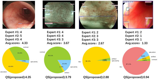 Figure 14 presents four example images displaying the scores given by the three experts, the average score, and QS computed using the proposed method. The QS scores of the images of different qualities are close to the expert scores. Figure 15 illustrates the correlation between the scores determined by the three experts and the proposed method.