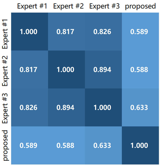 Heatmap between the mass scores of the three experts and the QS calculated by the proposed method.