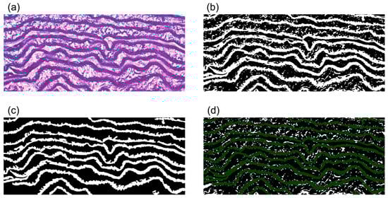 Process used to extract elastin interlaminar fibers between ELs. (a) Typical image of Elastica–Masson staining. (b) Elastin alone was extracted by thresholding the Green channel. (c) EL image created by selecting large and low-circularity regions in (b). (d) Image of interlaminar elastin fibers (white) obtained by subtracting panel (c) (dark green) from panel (b).