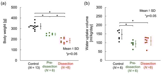 Figure 2 presents the body weight of the animals at sacrifice and the daily uptake volume of water during the last week before sacrifice. The body weight was 311.7 ± 13.3 g (N = 13) in the Control, 247.0 ± 10.3 g (N = 6) in the Pre-dissection, and 186.3 ± 21.0 g (N = 8) in the Dissection group. Significant differences in body weight were observed among all three groups. The daily water-uptake volume was 147.1 ± 27.0 mL/kg/day (N = 6) in the Control, 98.9 ± 17.8 mL/kg/day (N = 6) in the Pre-dissection, and 113.4 ± 24.1 mL/kg/day (N = 8) in the Dissection group. The daily water-uptake volume of the Control group was significantly higher than that of the Pre-dissection and Dissection groups. These data were consistent with previous reports showing that the weight [18,21,24] and water-uptake volume [21] were decreased after BAPN administration. All experimental data, including the following sections, can be obtained from the Supplementary Materials (Raw data).