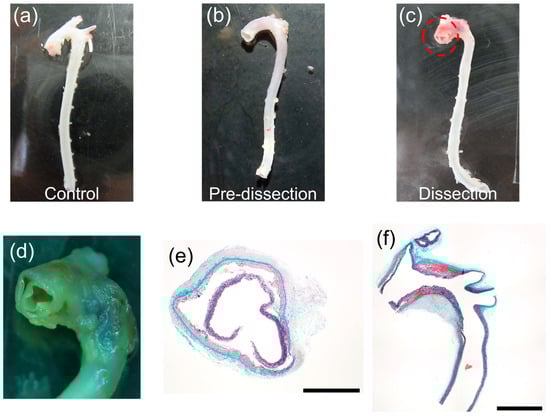 Typical images of the obtained thoracic aortas. (a–c) Whole images of the thoracic aortas of (a) the Control, (b) the Pre-dissection, and (c) the Dissection groups. (d) Magnified image of the ascending thoracic aorta (red circle in (c)). (e,f) Elastica–Masson staining images of the Dissection group in (e) axial and (f) sagittal cross-sections of AD regions. Bars in (e) = 1 mm and (f) = 2 mm.