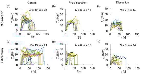 The time variation of the peel tension per unit length is shown in Figure 4 and Supplementary Videos S1–S6. Overall, the peel tension, Tp, increased up to about 10 s, remained almost constant for about 50–100 s, and dropped suddenly by failure. Each specimen required a different amount of time for specimen failure. In each group, the z-direction delamination test (Figure 4d–f) of a part of the specimens ended in a shorter time than did the θ-direction delamination test (Figure 4a–c). In these cases, specimens failed because the delaminated part deviated to either the adventitial or intimal side (Video S5).