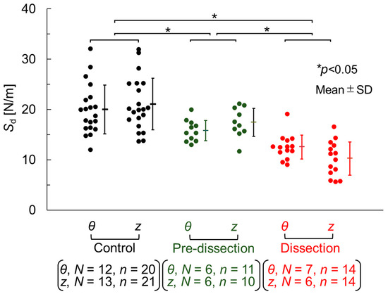 Figure 5 depicts the delamination strength of the three groups. In the Control group, the delamination strength was 20.0 ± 4.9 N/m (n = 20) in the θ-direction and 21.1 ± 5.1 N/m (n = 21) in the z-direction. In the Pre-dissection group, the delamination strength was 15.8 ± 2.0 N/m (n = 11) in the θ-direction and 17.4 ± 2.8 N/m (n = 10) in the z-direction. In the Dissection group, the delamination strength was 12.5 ± 2.4 N/m (n = 14) in the θ-direction and 10.2 ± 3.3 N/m (n = 14) in the z-direction. A two-way repeated-measures ANOVA revealed significant differences only at the AD stages. Post-hoc testing identified significant differences among all three groups. These statistical examinations demonstrated that the delamination strength decreased in the order of the Control, Pre-dissection, and Dissection groups. Although significant differences were not observed between the z- and θ-directions, the average delamination strength in the z-direction appeared to be larger than that detected in the θ-direction in the Control and Pre-dissection groups, and smaller in the Dissection group.