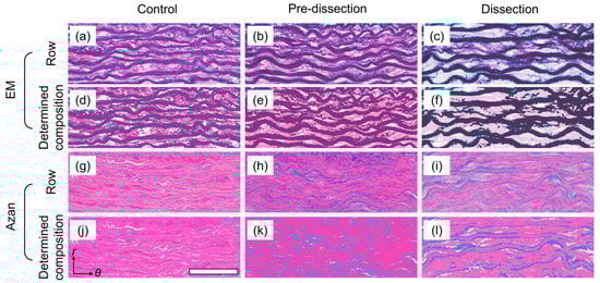 Figure 6 provides typical histological images. Elastica–Masson staining images revealed a decrease in elastin fibers, especially between ELs in the Dissection group (Figure 6c), compared with those in the Control (Figure 6a) and Pre-dissection (Figure 6b) groups. The ELs in the Dissection group (Figure 6c) appeared thicker than those in the Control (Figure 6a) and Pre-dissection (Figure 6b) groups. The collagen amount seemed to be increased in the Pre-dissection (Figure 6h) and Dissection (Figure 6i) groups compared with the Control group (Figure 6g), especially near ELs. Images that were reconstructed by assigning one of the tissue compositions to each pixel (Figure 6d–f,j–l) were similar to the original images (Figure 6a–c,g–i), thus supporting the validity of digital identification of tissue compositions.