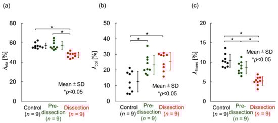 Figure 7a reports the area fraction of elastin. The area fractions of elastin were 56.9 ± 2.8% (n = 9) in the Control, 57.1 ± 4.2% (n = 9) in the Pre-dissection, and 47.2 ± 2.8% (n = 9) in the Dissection group. The area fraction of elastin in the Dissection group was significantly lower than area fractions in the Control and Pre-dissection groups. This result indicates that the elastin density decreased at the Dissection stage.
