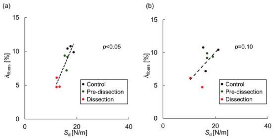Relationship between the delamination strength, Sd, and the area fraction of interlamellar fibers, λfibers, in the (a) θ-direction and (b) z-direction. Analyzed by t-tests.