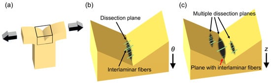 Possible mechanism underlying the more proactive decrease in z-delamination strength observed after the administration of BAPN. (a) Specimen during the delamination test. (b,c) Magnified views of the boxed area. (b) Specimen in the θ-direction delamination test showing a single dissection plane. (c) Specimen in the z-direction delamination test showing multiple dissection planes with different numbers of interlamellar fibers.