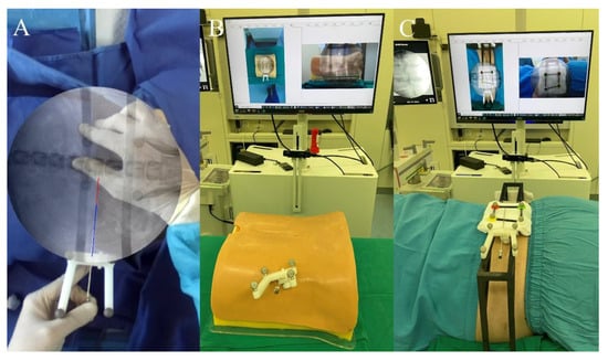 Following preparation, the patient entered the operating room and was positioned in a prone position on the operating table. Using a custom-made radiolucent bracket, surface fiducial markers were horizontally and perpendicularly placed on the patient’s back and flank. The surgical table, along with the patient, was then advanced into the C-arm, ensuring the patient’s surgical area was within the C-arm’s imaging range (Figure 4A). Radiographs of the lumbar spine were captured in both AP and lateral views. The positions of the C-arm and fiducial markers were adjusted until the X-ray images clearly displayed both the lumbar vertebrae and the fiducial markers (Figure 4B,C).