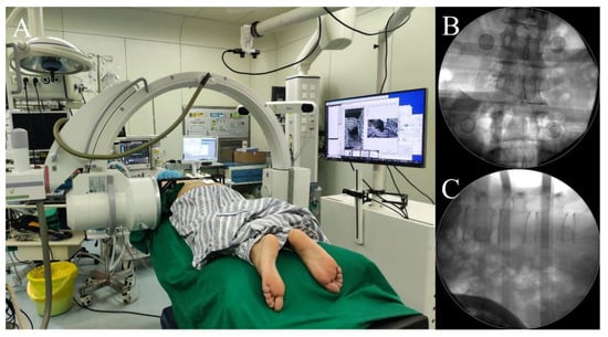 The patient’s surgical area and fiducial markers were positioned within the C-arm’s imaging range (A); thus, X-ray images clearly displayed both the lumbar vertebrae and the fiducial markers (B,C).