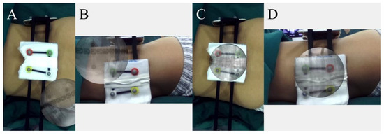 Before the overlay, the fiducial markers on the patient’s body surface could be seen in the video (A,B). After the overlay, AR radiographs were shown on the patient’s body in the video scene (C,D).