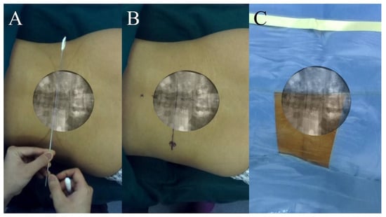 After the AR radiograph overlay, the surface fiducial markers were removed. The surgical target segment was identified in the AR radiographs. Utilizing the anatomical information from the AR radiographs, a Kirschner wire was positioned on the patient’s back to outline the puncture direction and identify the skin entry point. The Kirschner wire’s position was fine-tuned until its line intersected with the midpoint of the targeted intervertebral disc and the tip of the superior articular process, as seen in the AP overlaid radiograph (Figure 6A). The line along the Kirschner wire was then marked on the skin. The skin entry point was chosen and marked on this line, located 11–13 cm from the midline, varying with the patient’s body size (Figure 6B). Following preoperative localization, the surgical area underwent disinfection and draping (Figure 6C).