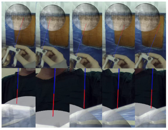 The puncture needle was affixed to a locator with markers, and its length was input into the ARSN system. This enabled the infrared tracking device to pinpoint the location of the puncture needle. Through calibration and coordinate transformation, the AR virtual puncture needle could be shown in the intraoperative video in real time. Before the puncture, an external test was conducted to validate the tracking precision. The real puncture needle was placed on the patient’s body. The location of the real puncture needle could be captured by the camera and shown in the video. Meanwhile, the AR virtual puncture needle was shown in the video. In both the AP and lateral views, the positions of the real puncture needle and the AR virtual puncture needle were recorded and compared at five different positions (Figure 7). The errors in the distance and angle were quantified utilizing the Image-Pro Plus software (version 6.0, Media Cybernetics, Rockville, MD, USA).