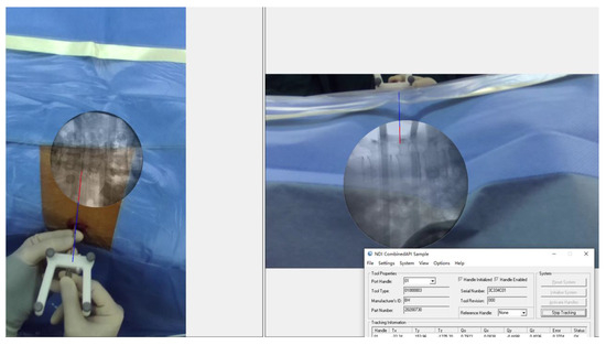Upon confirming the precision of AR tracking, the puncture procedure was performed under AR navigation. On the AR radiograph, the operator could identify the target (ventral side of the superior articular process of the surgical segment). Following local anesthesia, the puncture needle was introduced into the body through the predetermined entry point. At this time, the operator could see the position of the AR virtual puncture needle inside the body from the screen (Figure 8). Based on the position of the AR virtual puncture needle on the AR radiograph displayed by the ARSN system, the puncture needle was carefully adjusted until the AR virtual puncture needle reached the target on the AR radiograph: in the AP view, the tip of the puncture needle reached the lateral side of the superior articular process; in the lateral view, the tip of the needle reached the ventral side of the superior articular process. After the puncture, actual X-rays were taken to confirm the needle’s position, and adjustments were made, as needed.