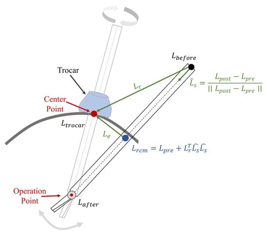 where means the direction of the surgical instrument axis, and represents the disparity in position between the trocar point and its location before the RCM point. In addition, the vector to the trocar point, from its nearest point on the instrument axis, is denoted as . The above definition is shown in Figure 2.
