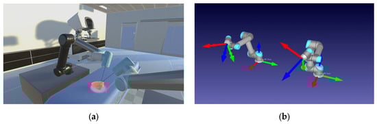 A system was designed to enable the real-time control of the digital-twin robots, as illustrated in Figure 5. This system is built upon platforms known as Unity3D [] (2021.3.30f1 LTS) and RoboDK v5.6.3. [,].