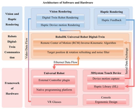 To ensure an effective integration of hardware and software, a comprehensive framework has been meticulously designed, as depicted in Figure 6. It combines bottom-up mechanisms through the hardware layer, the robots’ digital-twin communication layer, and the visual and haptic rendering layer. The Universal Robots and 3DSystem Touch devices are seamlessly integrated into the hardware layer, where they gather data from the operator’s movements. Once the motion data are collected within a 2 ms interval, it is packaged and transmitted to the digital-twin communication layer for noise filtering and processing through the remote center of motion (RCM) inverse kinematic algorithm. Subsequent to the data processing phase, Unity3D extracts digital-twin (DT) data and translates them into visual and haptic feedback data for the leader part. This comprehensive framework ensures smooth interaction and communication between the hardware and software components.