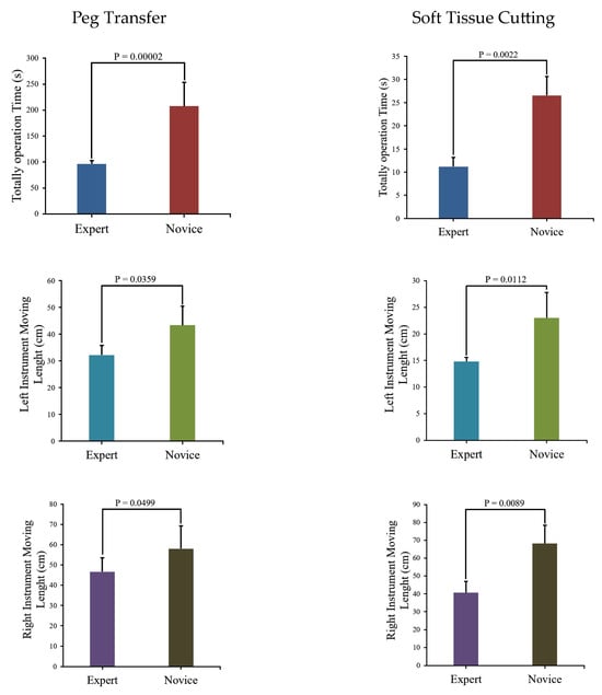 Upon the analysis of Table 7 and Figure 9, it becomes evident that a substantial disparity exists between expert and novice medical practitioners. The Expert Group demonstrate significantly shorter task completion times, reduced distances traveled during both left- and right-hand operations, and notably fewer instances of task failure when compared to their novice counterparts. Furthermore, the statistical significance tests conducted on the data yield p-values consistently below 0.05, underscoring the robustness and reliability of the data.