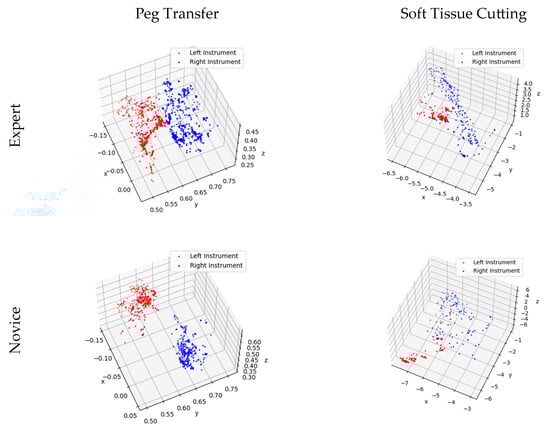 The figure indicates that the Novice Group requires significantly more time to complete two modules and their surgical instrument moving lengths are notably longer than those of the Expert Group. Instrument trajectories, illustrating the disparities between the Novice Group and Expert Group, were generated using Matplotlib [] and are presented in Figure 10.