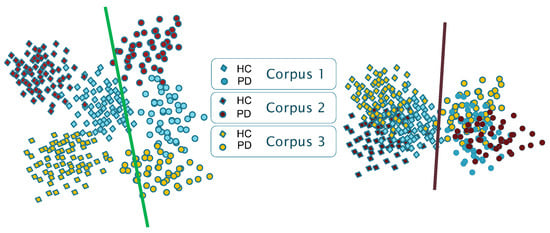 30], although the combination of multiple datasets is intended to model the representation space better and to avoid overfitting due to data scarcity, it can also induce certain unwanted behaviours, since DL approaches typically make use of shortcut learning strategies capable of reducing the training loss function by learning characteristics associated with the dataset (e.g., the language, microphone, recording equipment, acoustic environment, etc.) but not necessarily related with the specific phenomenon under analysis (i.e., the presence of PD). Despite this fact, which highlights a significant limitation of DL methods, also demonstrating a noticeable degradation in their discriminative capabilities across corpora, the most recent work continues to compare models based solely on their accuracy in a single corpus.