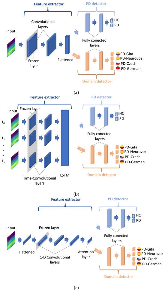 Figure 3 illustrates the three DL architectures adapted for DA training: 2D-CNN, Time-CNN-LSTM, and 1D-CNN. The choice of these base architectures is strongly motivated by their success in classifying PD from voice and speech, as demonstrated in [