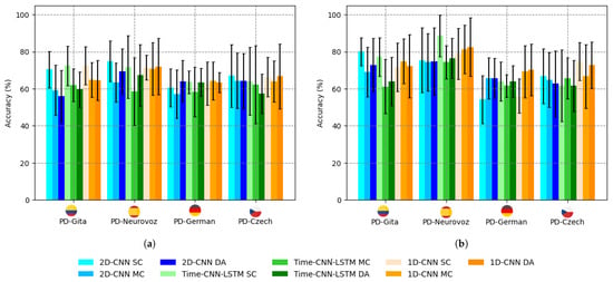 39]. For each architecture, a baseline model was developed by selecting the best hyperparameters for a binary categorisation of healthy and pathological voices using a database of voice disorders. The networks trained with this dataset were later adjusted to detect PD, following a TL strategy. For this purpose, the first layer was frozen, and each model was re-trained for the new task. The performance of these three baseline networks was evaluated within each corpus and with combined datasets. Finally, the accuracy of the baseline architectures was compared with their DA counterparts.