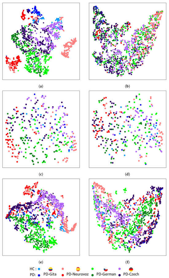 On the other hand, results reported based on the objective distance metrics used and based on the t-SNE plots extracted from the DA networks show that learnt features from the four corpora follow a similar clustering for both classes considered (i.e., HC and PD). Such clustering has demonstrated to be corpus independent and does not rely on language differences and potential variances in the channel characteristics.