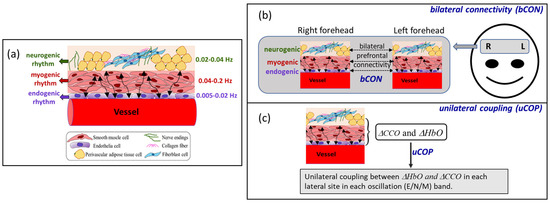 Vasomotion is a key contributor to metabolic and hemodynamic oscillations and has been explored in studies focusing on cerebral metabolic activity [6,7]. The relaxation and contraction patterns of the blood vessel walls have been identified as the driving forces behind the infraslow oscillations observed in cerebral hemodynamic signals [13,14,15,16]. Researchers have discovered three intrinsic rhythm bands within cerebral hemodynamic signals that align with the specific physiological and/or biochemical activities of the vascular wall layers [8,10,17]. The three frequency bands were classified as endogenic (E) (0.005–0.02 Hz), neurogenic (N) (0.02–0.04 Hz), and myogenic (M) (0.04–0.2 Hz) rhythms, as shown in Figure 1a [8,18,19]. The E band is caused by endothelium-derived vasomotor activities, which are mediated by mural cells. The N band involves the modulation of vessel dilation and contraction cycles by the oscillation of vasoactive ions and neurotransmitters released from neurons. Lastly, rhythmic M activity is a result of the relaxation and contraction of smooth muscle cells within the vascular walls. Figure 1a illustrates the anatomical structures and respective rhythm frequencies of the three infraslow oscillation components at a local cerebral site [20]. Figure 1b,c further graphically explain the bilateral prefrontal connectivity and unilateral coupling derived from the HbO and CCO signals, respectively. The mathematical principle and operation to derive the three E/N/M bands are shown schematically in Figure S1 of Section SA of the Supplementary Materials.
