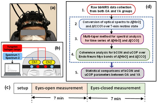 The following supporting information can be downloaded at: https://www.mdpi.com/article/10.3390/bioengineering10111336/s1. Figure S1: (a) A 7-min time series of Δ[HbO] derived from one of the two-channel bbNIRS data sets from a random participant. The three panels in (b) on the right were obtained after Butterworth band-pass filtering of the original signal in the three predefined E/N/M bands, namely, 0.005–0.02 Hz, 0.02–0.04 Hz, and 0.04–0.2 Hz, respectively. Figure S2: A data processing flow chart used to quantify Δ[HbO], Δ[HHb], and Δ[CCO] from raw bbNIRS data. Figure S3: Schematic flow chart of spectral analysis for the quantification of coherence. For demonstration, two time series, Δ[HbO] and Δ[CCO], are used as separate input signals with a time period of ‘t’. Blue and orange blocks represent frequency analysis steps operated on signal 1 (i.e., Δ[HbO]) and signal 2 (i.e., Δ[CCO]), using the “ft_freqanalysis” function (outlined by black dashed boxes). The words “double” and “complex” indicate a real number with double precision and a complex number, respectively. Furthermore, green blocks represent the connectivity analysis steps operated on the frequency-domain outputs of the two signals, using the “ft_connectivityanalysis” function (red dashed box). Table S1: Comparisons of bCON and uCOP metrics under eyes-closed and eyes-open conditions from older adults (n = 24). Table S2: Comparisons of gender differences in bCON and uCOP metrics in young adults (n = 26).