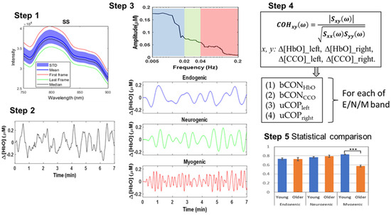 Step 1: An assortment of raw optical spectra acquired using bbNIRS, averaged over a 7-min collection time. The mean and median spectra are represented by shading with standard deviation and outlined by the highest and lowest spectra. Step 2: This panel exhibits a 7-min time series of Δ[HbO] from a random participant as an example. Step 3: A quantified spectral amplitude of Δ[HbO] is presented after multi-taper spectral analysis was employed. The E/N/M frequency bands are marked by blue, green, and red boxes, respectively. Accordingly, the frequency-decomposed time series of the spectral curve were obtained in respective E/N/M bands, with matched colors (blue for E, green for N, and red for M band). Step 4: It graphically illustrates the quantification of coherence for four pairs of Δ[HbO] and Δ[CCO] on each lateral side in each E/N/M band. Step 5: It graphically illustrates statistical comparisons between the two age groups for the respective parameters.