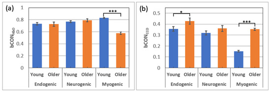 Note that the bCONHbO and bCONCCO values for young adults (n = 26) were grand averaged over five visits [8], while older adults had only one visit for the measurements (n = 24). The outcome of such a difference in the sampling size between the two groups is addressed in the Section 4.