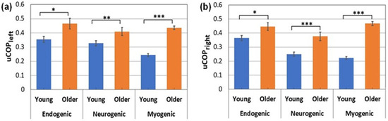 The same coherence analysis was performed to find the unilateral hemodynamic–mitochondrial coupling on the left and right side of the prefrontal cortex from older adults (n = 24) and young adults (n = 26 [8]) in the eyes-closed resting state. The results are plotted in Figure 5a,b for all three E/N/M bands. As shown in Figure 5, older adults exhibited significantly larger coherence between ∆[HbO] and ∆[CCO] oscillations in all three frequency bands, indicating stronger mitochondrial–hemodynamic couplings on either side of the prefrontal cortex (i.e., uCOPleft and uCOPright) than in younger adults. In particular, such unilateral coupling on both lateral sides of the older adults was much stronger in the myogenic frequency band than in the young adult group, with very large effect sizes of 1.96 and 2.72 (see Table 2). Unilateral coupling strengths at the endogenic and neurogenic frequency bands in the older adult group were significantly larger with a medium effect size (0.5–0.8) than those in the young adult group (Table 2).