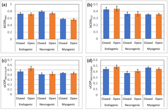 Comparisons of (a) bCONHbO, (b) bCONCCO, (c) uCOPleft, and (d) uCOPright measured from older adults under eyes-open and eyes-closed conditions. There was no significant difference in any of the metrics under the two different measurement conditions. Detailed values for each panel are available in Table S1 of Section SD of the Supplementary Materials.