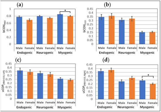 Gender comparison of prefrontal bilateral connectivity and unilateral coupling within the young adult group (males = 14; females = 12) for (a) bCONHbO, (b) bCONCCO, (c) uCOPleft, and (d) uCOPright over the E/N/M bands. The error bars are the standard error of the mean. *: p < 0.05. Detailed values for each panel are available in Table S2 of Section SE of the Supplementary Materials.