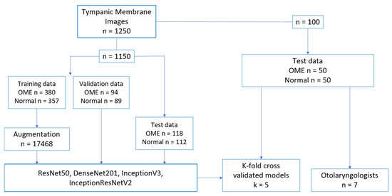 The training/validation/testing datasets contained 592 OME and 558 normal tympanic membrane images. Of these 1150 images, 920 images were used for the training/validation datasets, consisting of 474 OME images and 446 normal images, which were split into a ratio of 8:2 for training (380 OME, 357 normal) and validation (94 OME, 89 normal). A total of 230 images were used for the test dataset, which consisted of 118 OME images and 112 normal images. The 920 training images and 230 test images were randomly selected for each cross-validation fold. An additional 50 OME and 50 normal images separate from the training/validation dataset were set aside to compare deep learning model diagnostic performances with those of 7 otolaryngologists. An example of data allocation is shown in Figure 1.