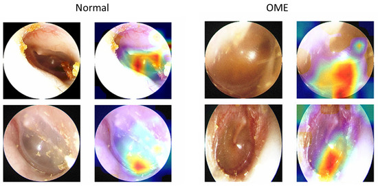 Heatmaps illustrating the focal points of tympanic membrane images utilized in prediction overlaid on top of tympanic images are shown in Figure 2. The intense portions of the heatmap (colored in red) seemed to focus on the anterior inferior quadrant of the tympanic membrane (the most gravitationally dependent area of the middle ear where fluid accumulates) in determining both normal and OME images.