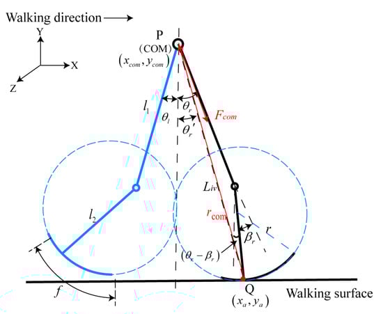 where represents the rotational momentum around point Q, and and represent the vector from point Q to the COM and the inertial force acting on the COM, respectively. In a stable gait during the stance phase, since the angular momentum is conserved, Equation (4) equals 0, and the equation of motion can be expressed as