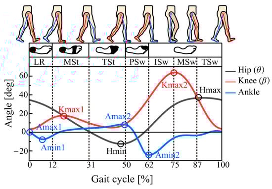 As shown in Figure 3, a gait cycle can be divided into seven phases: loading response (LR), mid-stance (MSt), terminal stance (TSt), pre-swing (PSw), initial swing (ISw), mid-swing (MSw), and terminal swing (TSw). Hip motion plays an important role when walking forward. In this figure, Hmax represents the highest point of forward flexion of the thigh, and Hmin represents the highest point of backward extension of the thigh. The two points give the thigh span during walking, which is strongly related to the step length. Kmax1 and Kmax2 represent the knee angle to achieve foot clearance at the initial swing phase and the maximum knee flexion angle, respectively. Amax1 represents the dorsiflexion angle at the heel strike, Amin1, the plantar flexion angle at the flat foot, Amax2, the dorsiflexion angle at the heel-off, and Amin2, the plantar flexion angle at the toe-off.