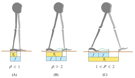 In normal walking, the step length is always larger than the foot length. Therefore, the minimum value of the roll factor is greater than 1. On the other hand, we understand from Equation (4) that the maximum value of the roll factor is less than 2 for an inverted pendulum motion. This is described in Figure 4. An abnormal gait with a roll factor of less than 1 usually occurs in the elderly with weakened lower limb muscle strength. When the roll factor is larger than 2, the gait is inefficient. Only when the value of the roll factor is between 1 and 2 does the human body walk efficiently and stably as an inverted pendulum. Therefore, we can use the roll factor to judge the walking state of a person.