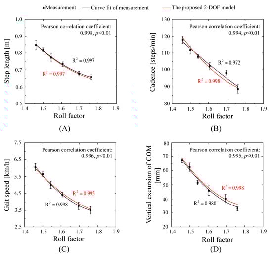The kinematic parameters of the seven subjects in the treadmill test are plotted against roll factors in Figure 6 for both measurements and calculations using the proposed 2-DOF model. The black fitting curves of the gait parameter were obtained using the measured values (black points) that were acquired from able-bodied subjects (the goodness-of-fit values were , , , and ). The red fitting curves of the gait parameter were obtained using the 2-DOF inverted pendulum walk model (the goodness-of-fit values were , , , and ). The model well agrees with the measurements, demonstrating the validity of the proposed model. The Pearson correlation between the model and the measurements were 0.996, 0.995, 0.998, and 0.994 for step length, cadence, gait speed, and vertical excursion of the COM, respectively (p < 0.01).