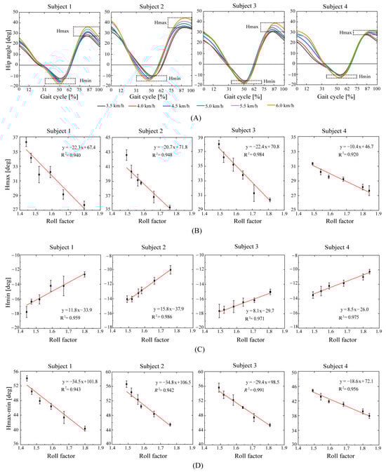 The hip joint angles at different speeds are shown in Figure 7A. It shows that the Hmax increases with the increase in speed, although there are individual differences between different subjects. From Figure 7B,C, we know that both Hmin and Hmax have a linear relationship with the roll factor (the Hmax goodness-of-fit values are , , , and ; the Hmin goodness-of-fit values are , , , and ). As shown in Figure 7D, the difference between Hmax and Hmin also decreases linearly with the roll factor (the goodness-of-fit values are , , , and ).