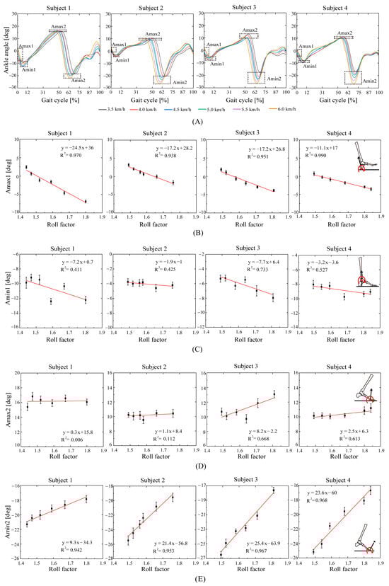 Figure 9 shows that with the decrease in the roll factor, the dorsiflexion angle at heel strike (Amax1) and the plantar flexion angle at flat foot (Amin1) decrease, while the plantar flexion angle at the toe-off (Amin2) increases in the negative direction in a linear way (Figure 9B,C,E), and the dorsiflexion angle at the heel-off (Amax2) increases linearly with the roll factor (Figure 9D). The dorsiflexion angle at the heel strike (the Amax1 goodness-of-fit values are , , , and ) and the plantar flexion angle at the toe-off (the Amin2 goodness-of-fit values are , , and ) have high correlation with the roll factor (Figure 8B,E). In contrast, the Amin1 (Figure 9C) and Amax2 (Figure 9D) show low goodness-of-fit values (the Amin1 goodness-of-fit values are , , , and ; the Amax2 goodness-of-fit values are , , , and ). This means the two values have no relationship with the roll factor.