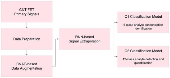 Thus, it can be briefly said that, in this study, we applied deep learning algorithms for signal processing obtained from three comparable CNT FET biosensors. Our primary objective was to automatically identify and quantify specific analytes using segments of these recorded signals. However, achieving this classification objective posed challenges that needed to be addressed. Consequently, we employed three key deep learning-based signal analysis techniques to overcome these challenges and fulfil our research objectives. These techniques were categorized into three main steps: (1) data augmentation, (2) signal extrapolation, and (3) classification models. Additionally, all calculations and deep learning algorithms were executed using MATLAB R2022b.