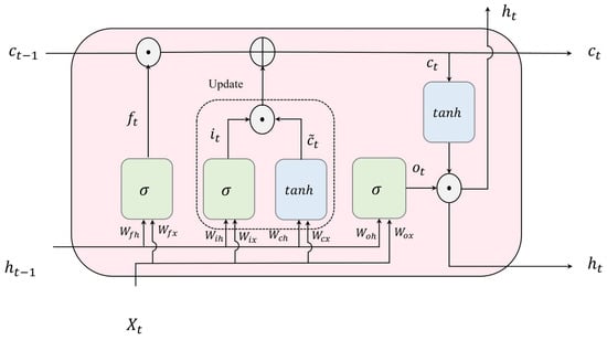 The input gate, represented as , and the cell candidate, denoted as , are in charge of modifying and managing the memory cell state, . The forget gate, denoted as , decides which details from the previous time step stored in the cell state should be disregarded. The output gate, , selects the portion of the cell state that contributes to the output, . Equations (2)–(6) governing these processes at time step t are as follows: