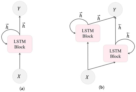 Transmission of data within an LSTM layer: (a) a ULSTM layer with forward states, and (b) a BLSTM layer with both forward and backward states. Here, X, Y, , and represent the input, output, forward and backward states in the BLSTM layer, respectively.