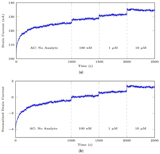 Further clarity is needed regarding the terms entire signal and segment, as they are frequently used throughout this paper. In this context, the term entire signal points out all the registered sensing responses from the start to the end of an experiment. Conversely, a segment denotes a specific portion of the entire signal that illustrates the sensor’s registered data to a particular concentration of the target analyte. For example, in Figure 10a, the data at are considered as the entire signal, and this signal consists of three distinct segments: for the No Analyte segment, for the 1 μM segment, and for the 10 μM segment.