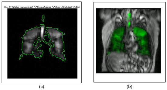 Illustration of the semi-automated segmentation method and its limitations. (a) Significant manual intervention is required in the process, particularly in the removal of the trachea from the hyperpolarized gas MRI segmentation. Description of what is contained in the first panel. (b) A visual representation of the registration process using landmarks, demonstrating the intricate steps involved in the segmentation method. The green color indicates the distribution of hyperpolarized gas. Screenshots taken using MATLAB R2021b.