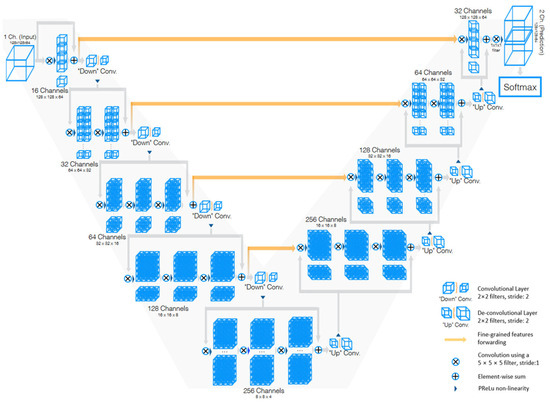 - Milletari, F.; Navab, N.; Ahmadi, S.-A. V-Net: Fully Convolutional Neural Networks for Volumetric Medical Image Segmentation. In Proceedings of the 2016 Fourth International Conference on 3D Vision (3DV), Stanford, CA, USA, 25–28 October 2016; pp. 565–571. [Google Scholar]