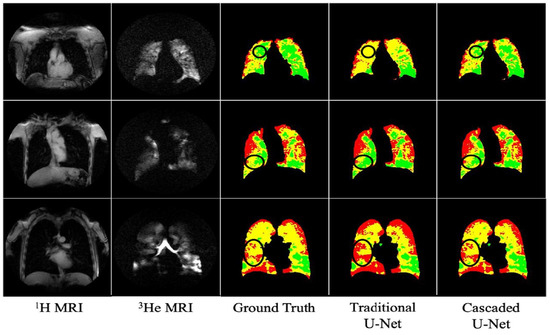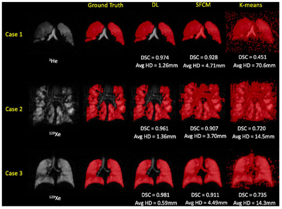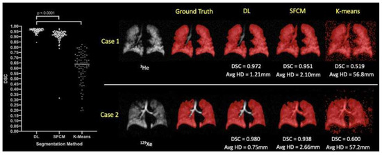 In recent years, the advancement of deep learning has ushered in a new era for medical imaging, including image segmentation [37,38,39]. DL-based models, harnessing the power of artificial intelligence, have demonstrated exceptional prowess in the automatic segmentation of medical images, revolutionizing this complex task. These models have proven to be highly efficient and accurate, outperforming traditional methods and offering a transformative approach to medical image analysis. DL methods have shown great success in many areas of medical image analysis [40]. These methods are both efficient and accurate. They have been used for tasks such as identifying brain tumors [41], separating the lungs in CT images [42], aiding in breast cancer radiotherapy [43], and tracking lung changes in COPD [44]. Deep learning has shown promising results in hyperpolarized gas MRI. In a research article [45], deep learning was utilized to improve image reconstruction quality. A deep cascade of residual dense networks (DC-RDNs) was crafted to reconstruct high-quality DW images from substantially undersampled k-space data. The study utilized hyperpolarized 129Xe lung ventilation images from 101 participants to create synthetic DW-MRI data, which then trained the DC-RDN. The performance of the DC-RDN was subsequently assessed using both retrospectively and prospectively undersampled multiple b-value 129Xe MRI datasets, demonstrating its effectiveness in enhancing DW-MRI for lung morphometry. Another study also introduced PhysVENeT [46], a 3D multi-channel convolutional neural network that synthesizes 3D ventilation surrogates from MRI scans. This approach, which incorporates physiologically informed ventilation mapping and structural imaging, showed superior performance over conventional mapping and other DL methods, offering an accurate reflection of ventilation defects with minimal overfitting. Several studies have also used DL techniques for the segmentation of ventilated lungs [47,48,49].