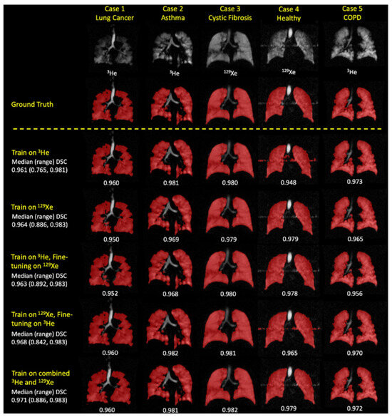 - Astley, J.R.; Biancardi, A.M.; Hughes, P.J.C.; Marshall, H.; Smith, L.J.; Collier, G.J.; Eaden, J.A.; Weatherley, N.D.; Hatton, M.Q.; Wild, J.M.; et al. Large-Scale Investigation of Deep Learning Approaches for Ventilated Lung Segmentation Using Multi-Nuclear Hyperpolarized Gas MRI. Sci. Rep. 2022, 12, 10566. [Google Scholar] [CrossRef] [PubMed]